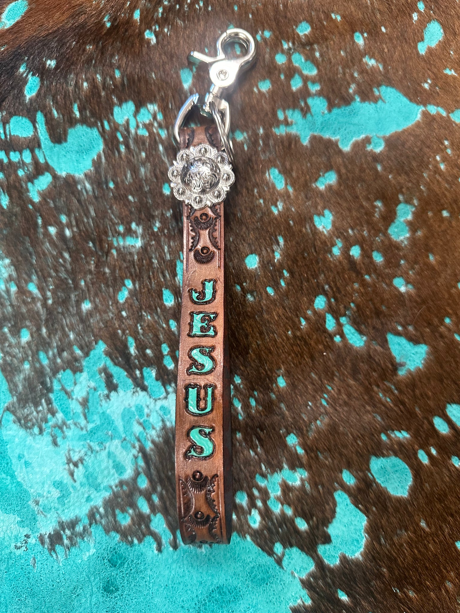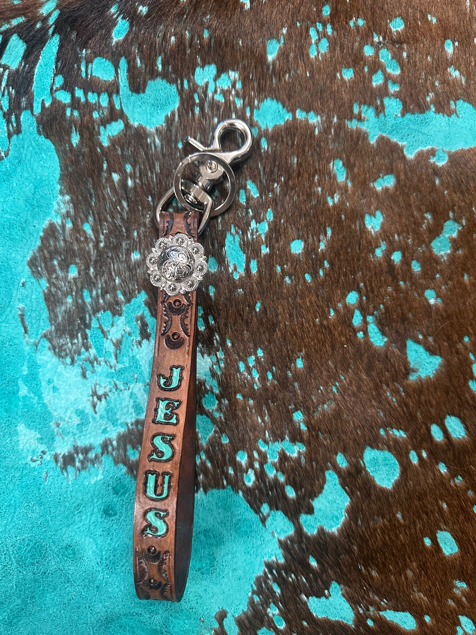 Beautiful tooled and painted leather key chain that can be personalized with up to 8 letters.