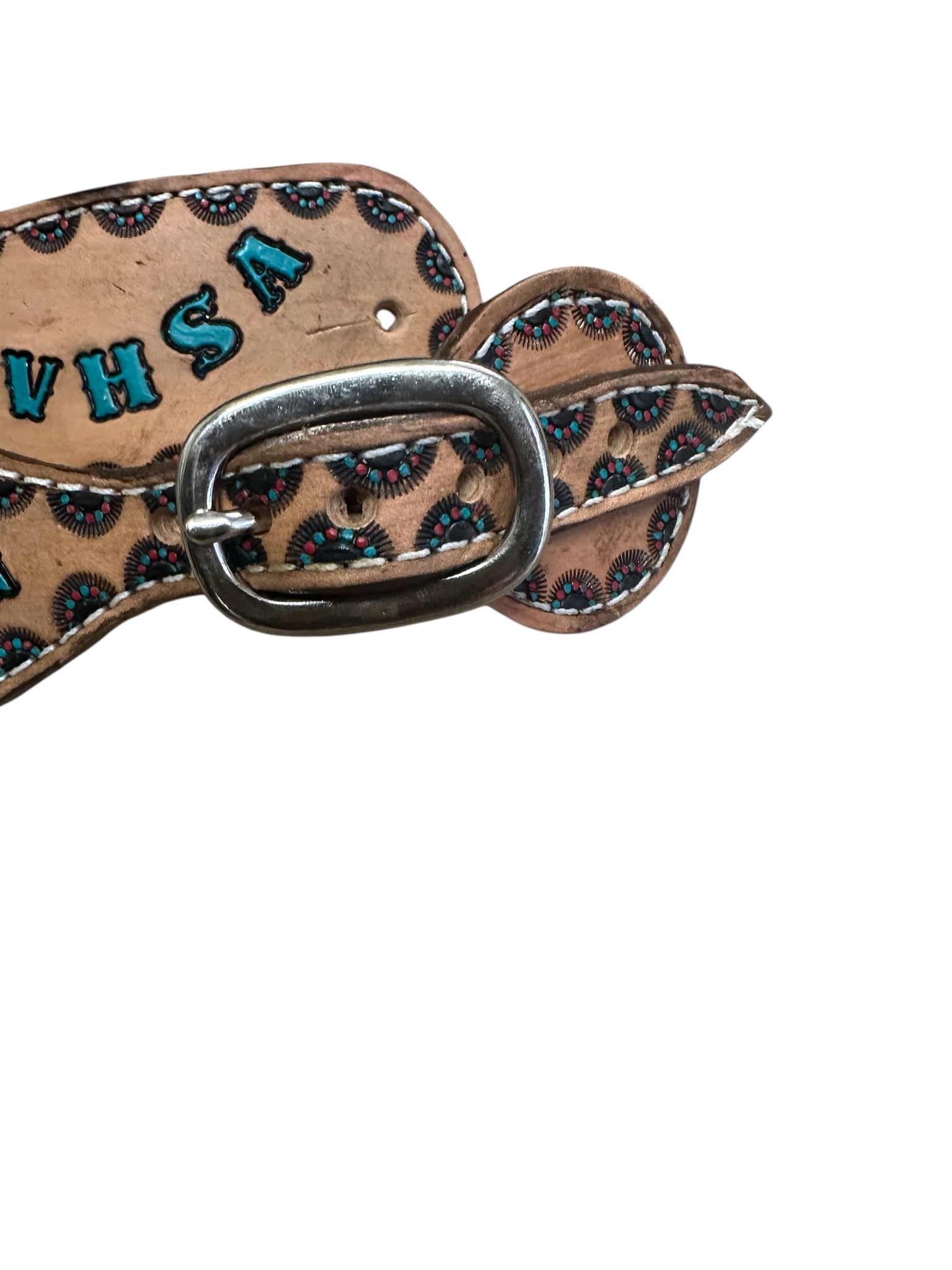 Beautiful personalized hand tooled and painted leather spur straps in junior size.
