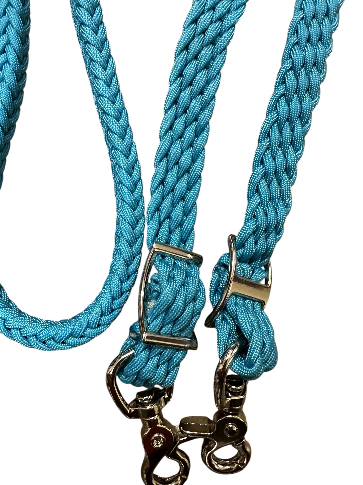 looking for a basic riding rein? This braided rein is braided out of the finest 550 Paracord and is round braided .   It attaches  to the bit with trigger snaps.  You can choose any color in the color chart or up to 4 colors.