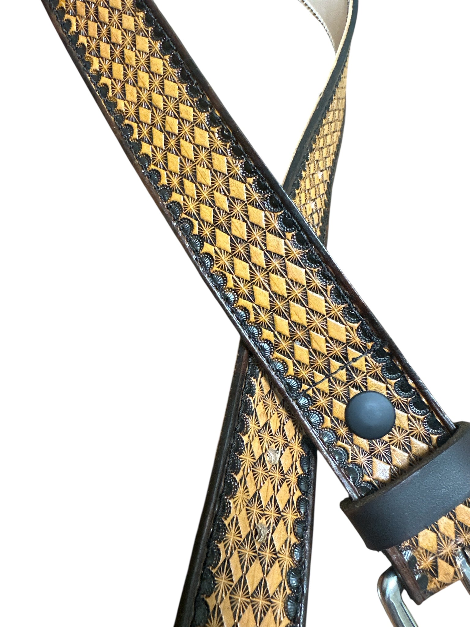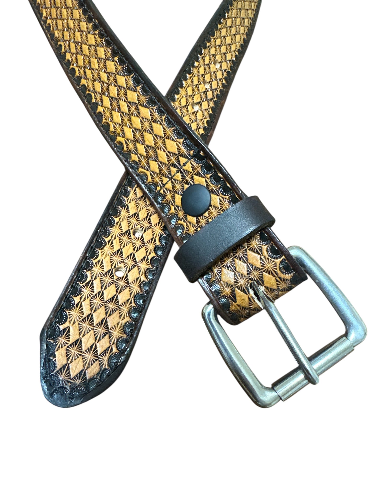 This belt is hand tooled and painted out of a live oak veg tan leather. It is lined and has a removable buckle.