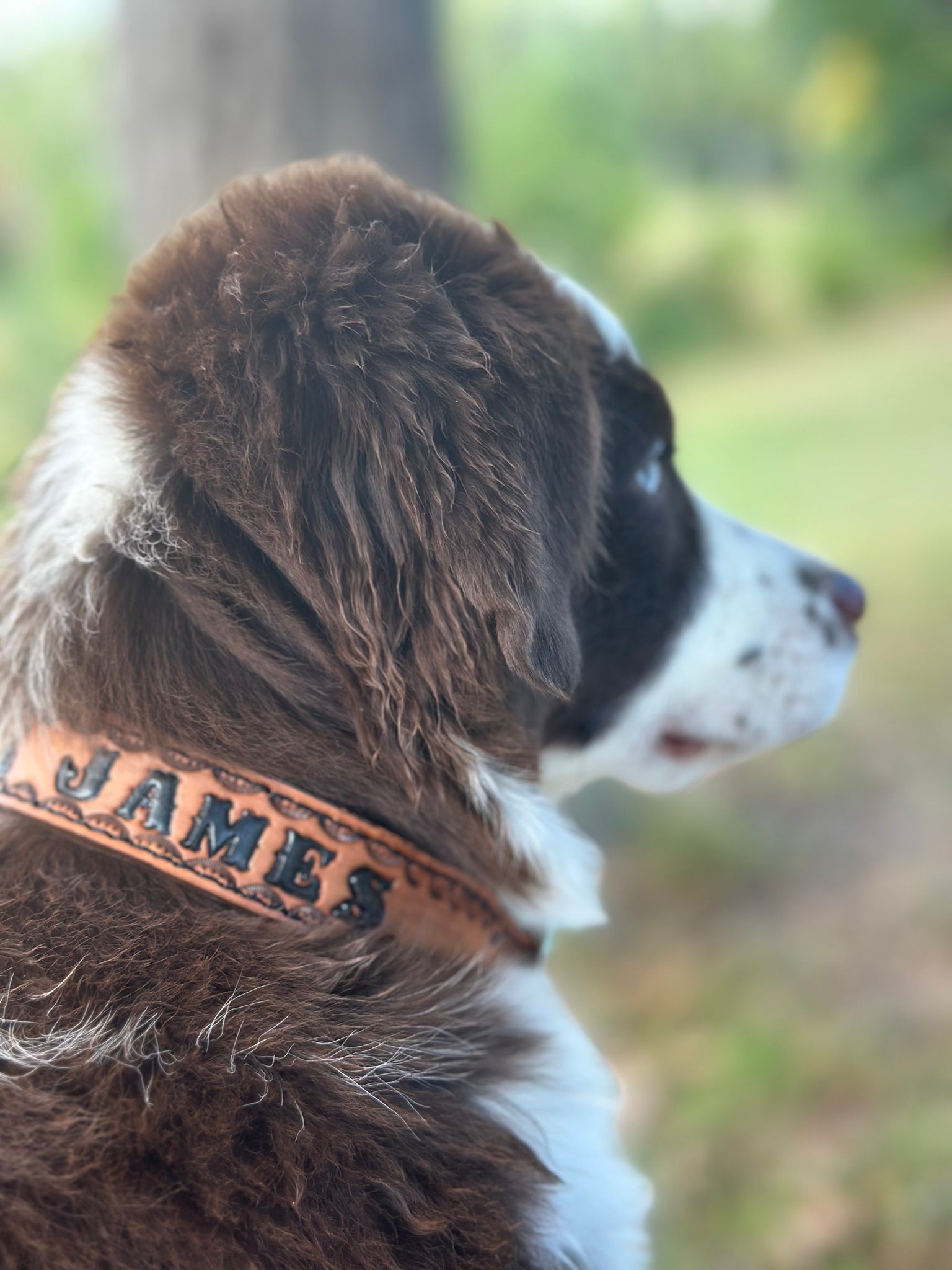 Beautiful handtooled dog collar with a cross basket stamp weave from our TBT Leather line. I can change the paint colors. It is lined with a soft black leather .