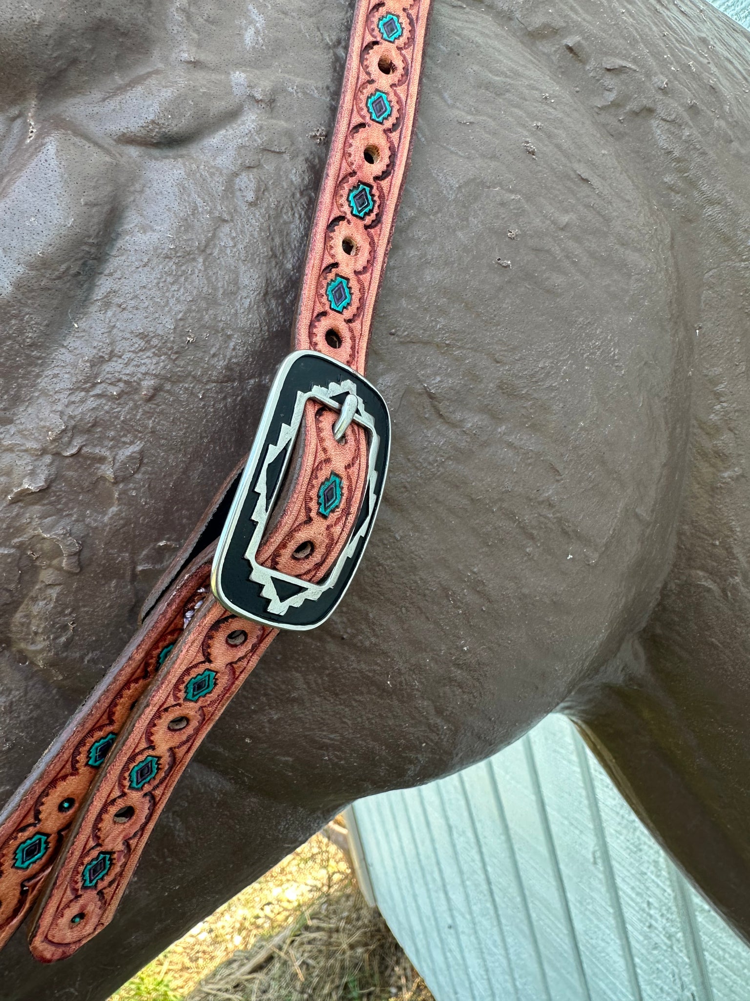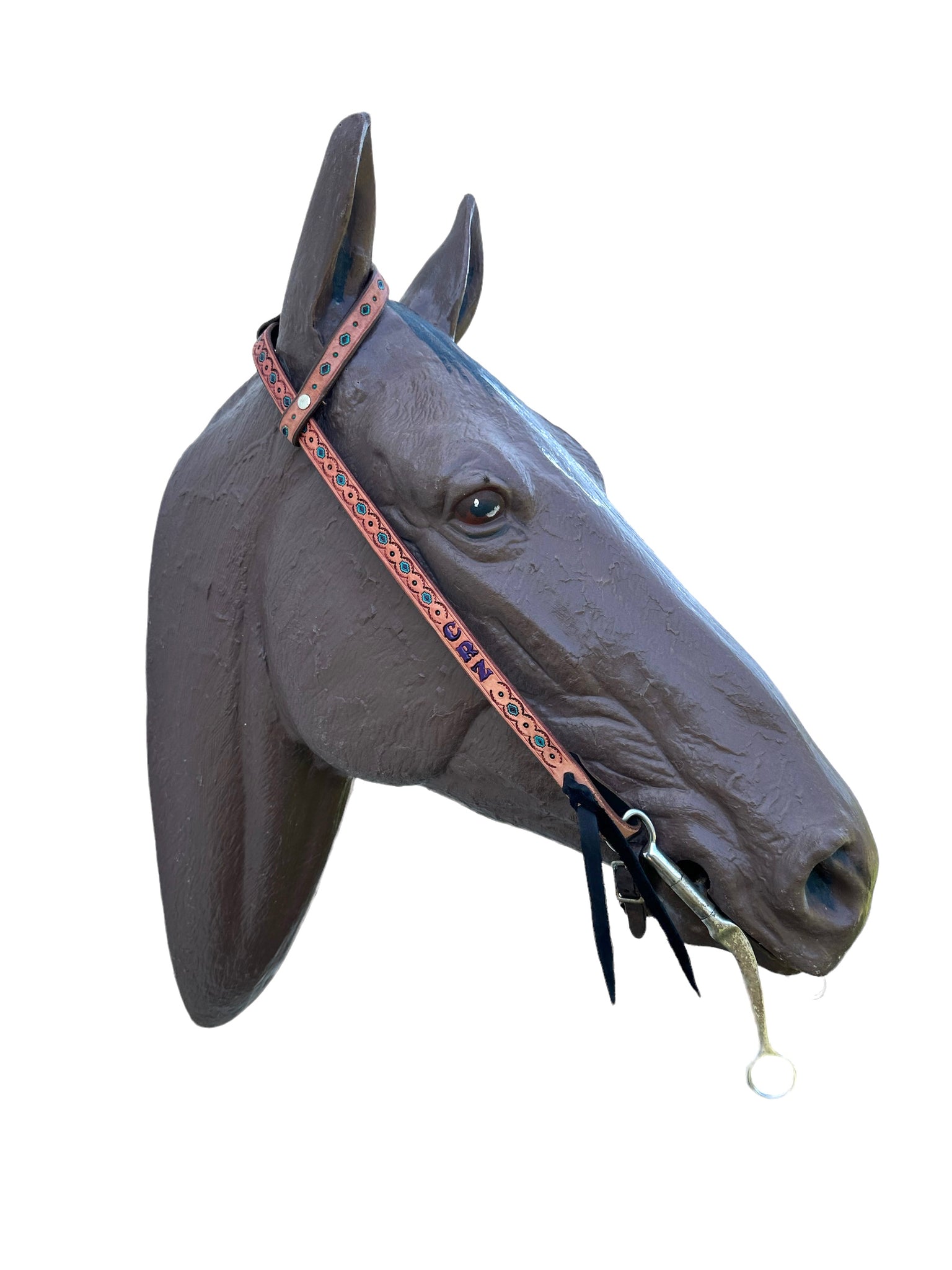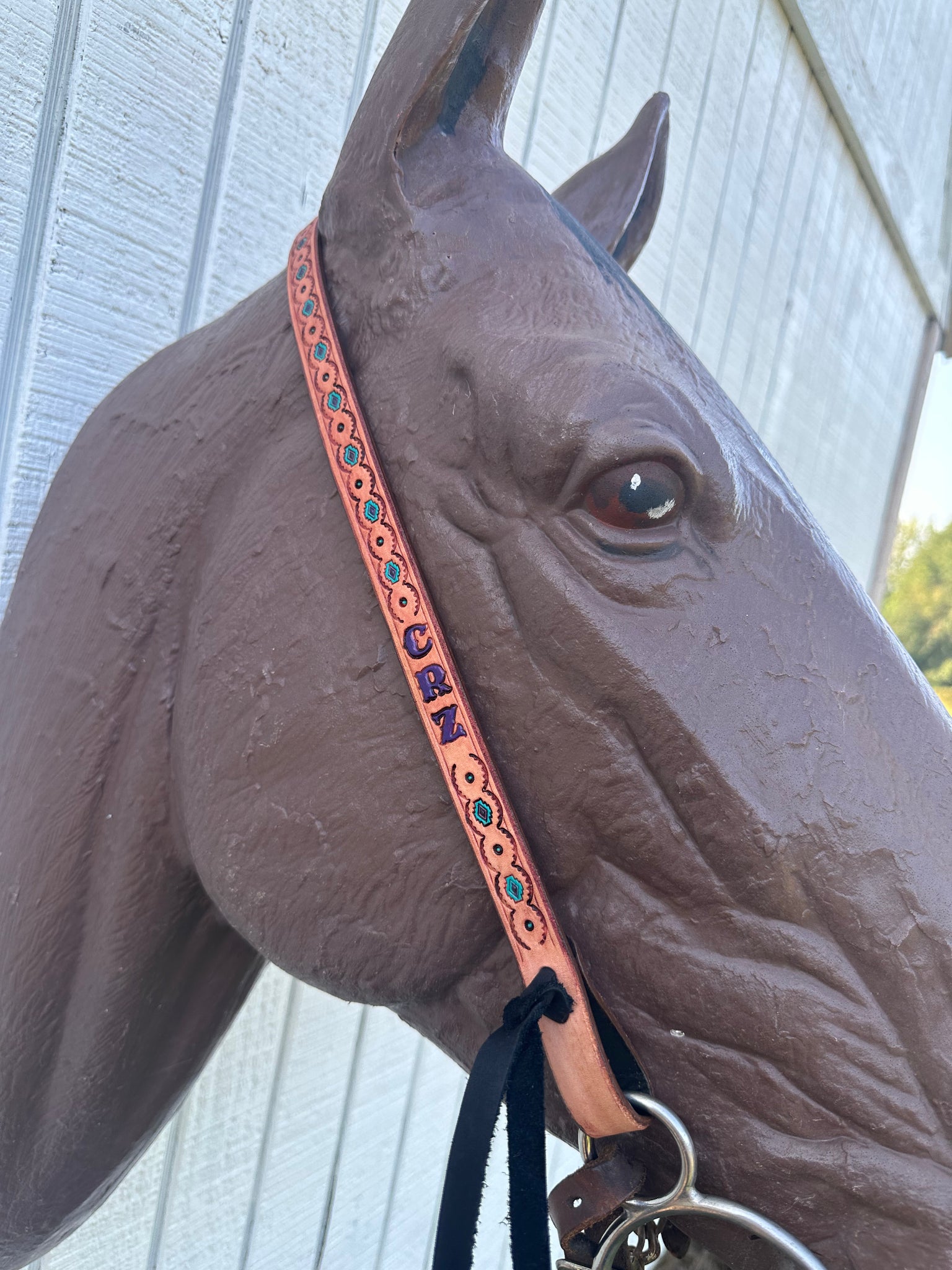 one ear leather bridle with personalized cheek piece. This is a light oil Herman oak piece of leather. You can have up to 8 letters.