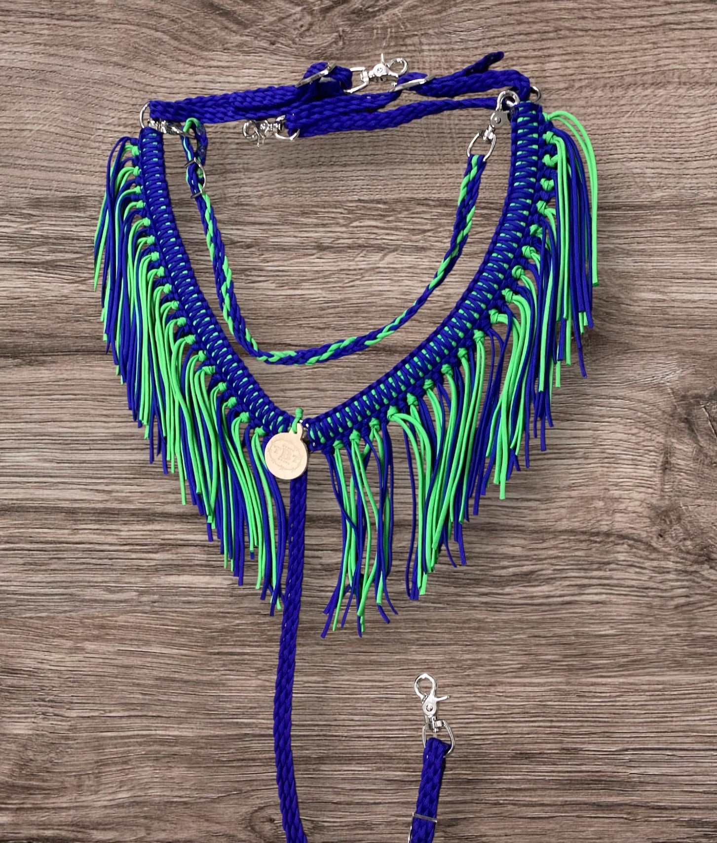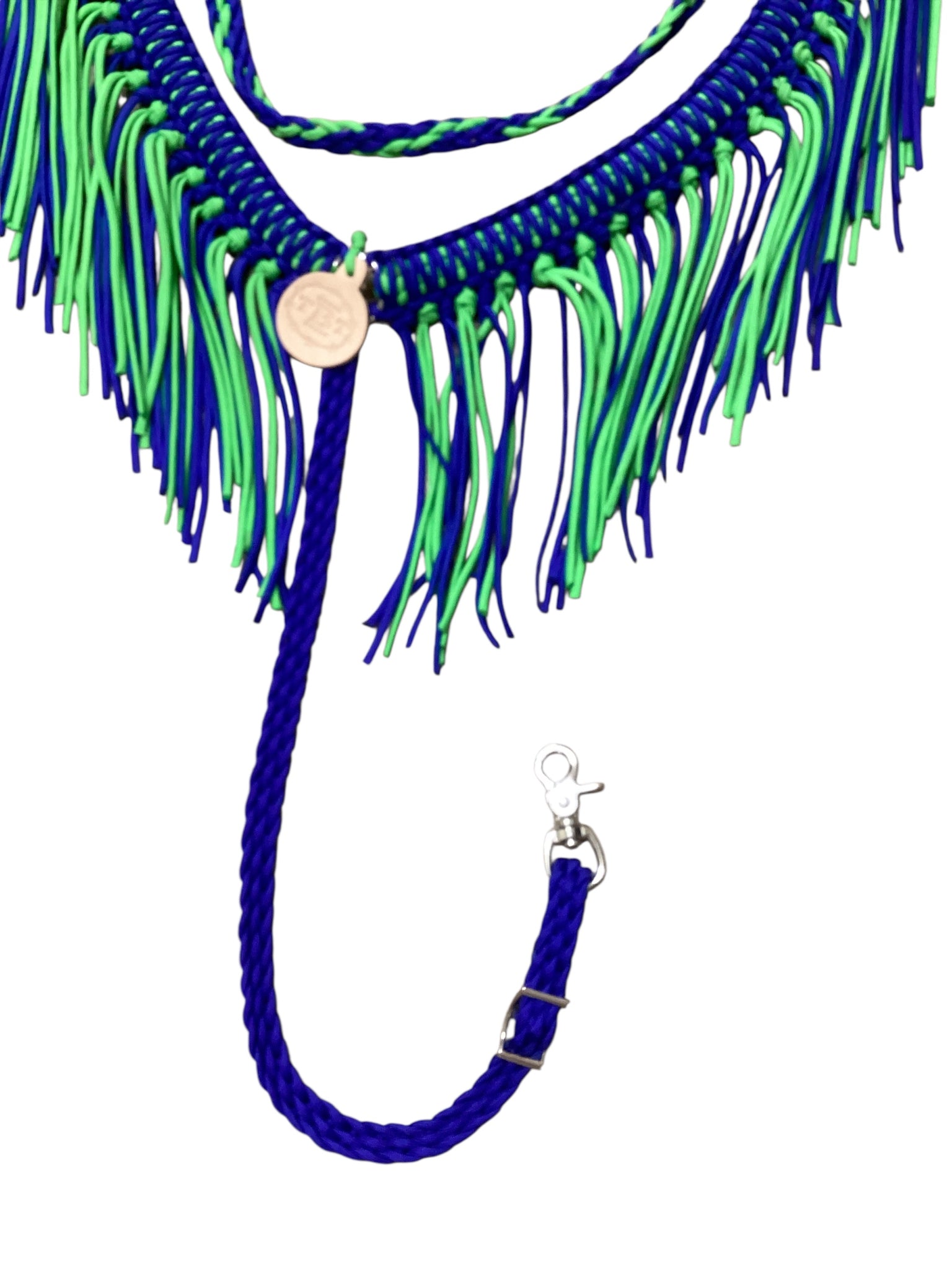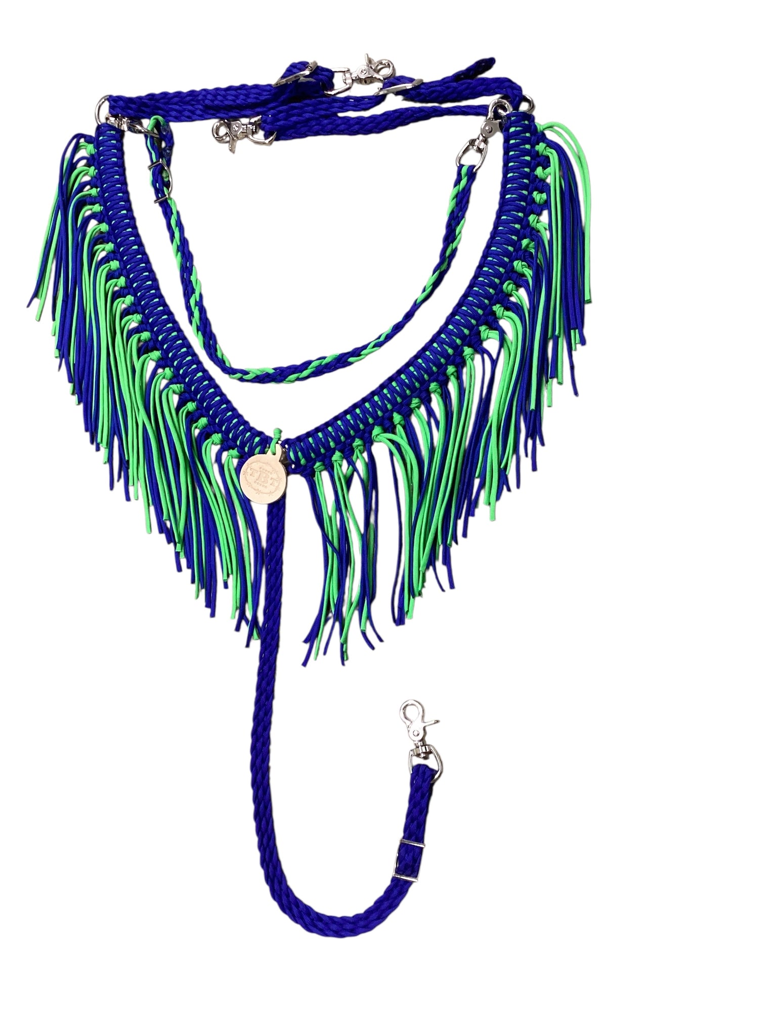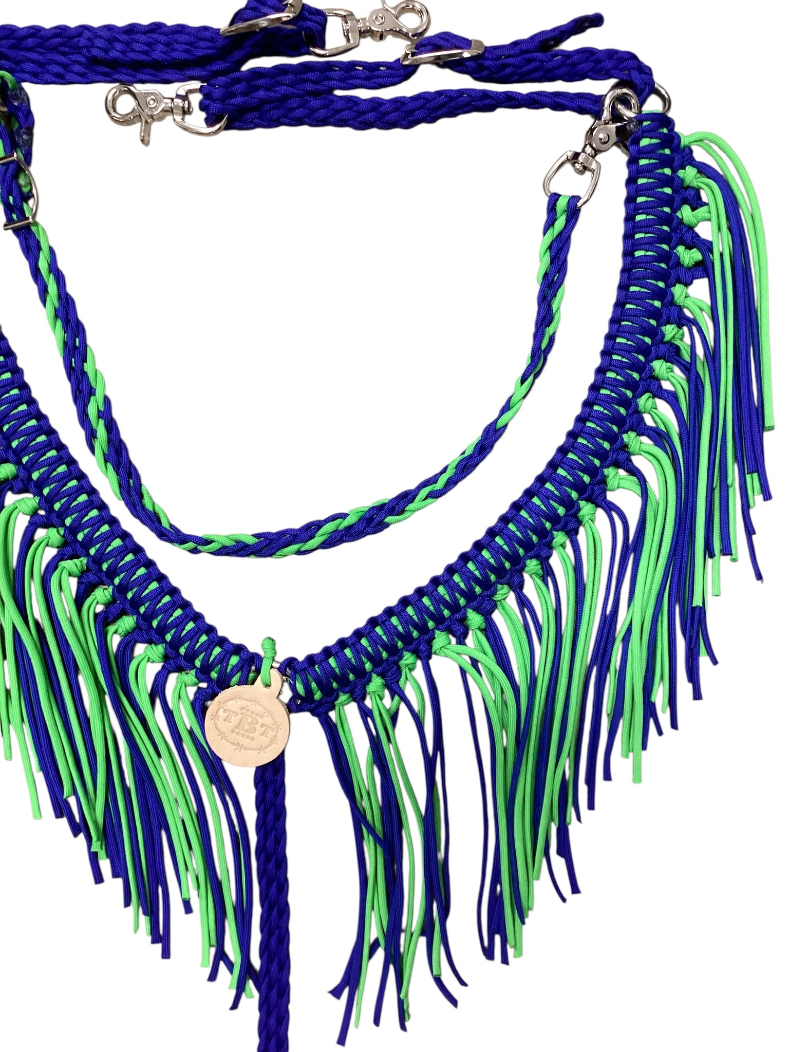 This is a fringe breast collar that is hand braided out of the highest quality 550 paracord. It is very adjustable. The rings are stainless steel. It takes up on the side very simply with roller buckles. I have attached trigger snaps to the sides and the bottom tugs to make it easy attach.