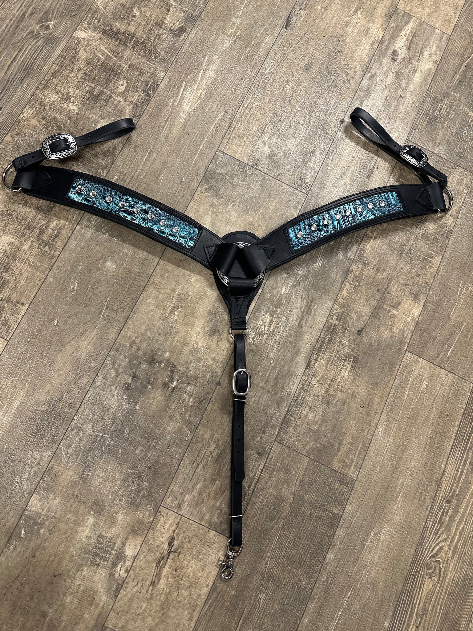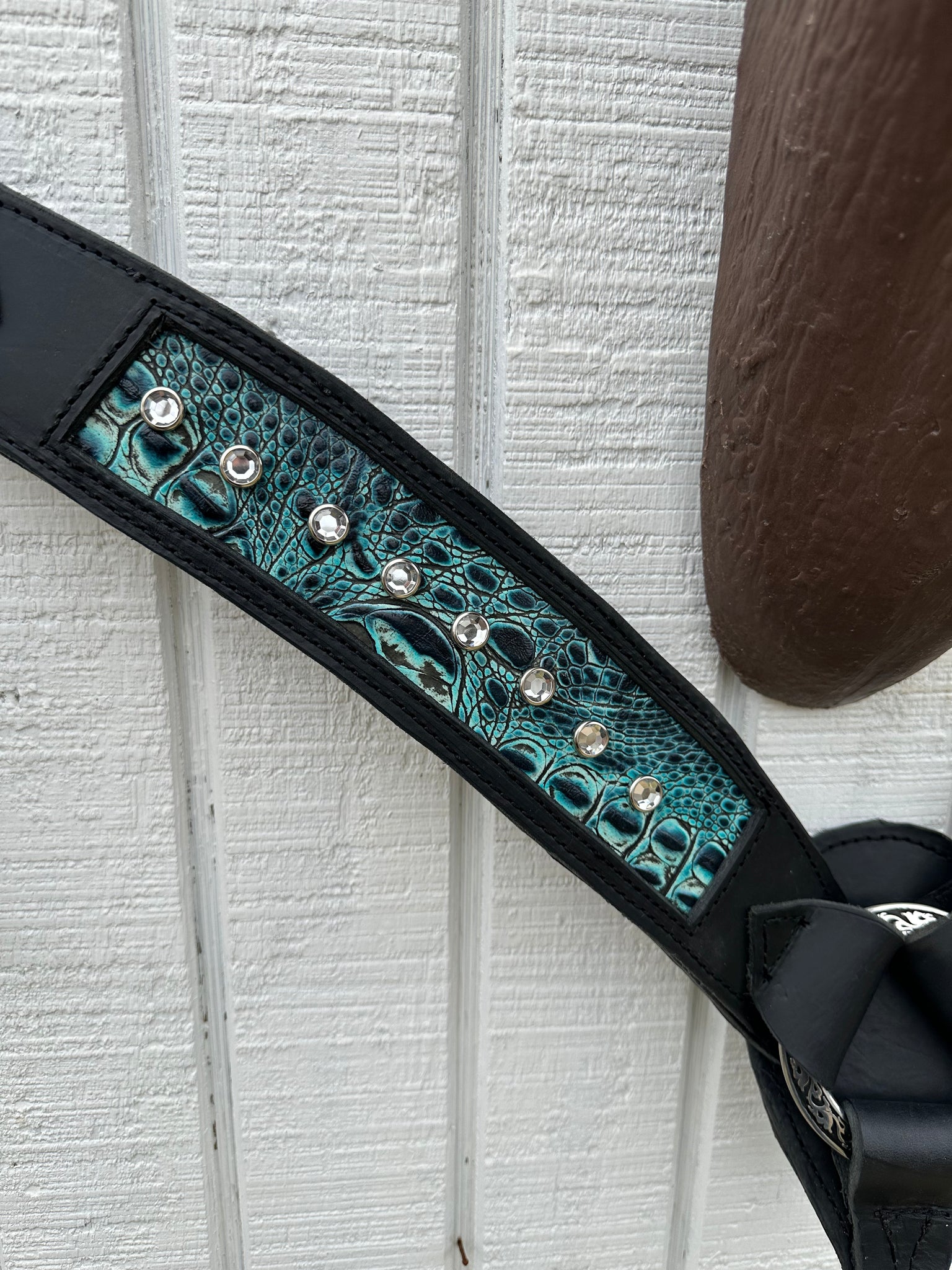 This leather breast collar is made from black bridle leather with croc overlays and rhinestones.