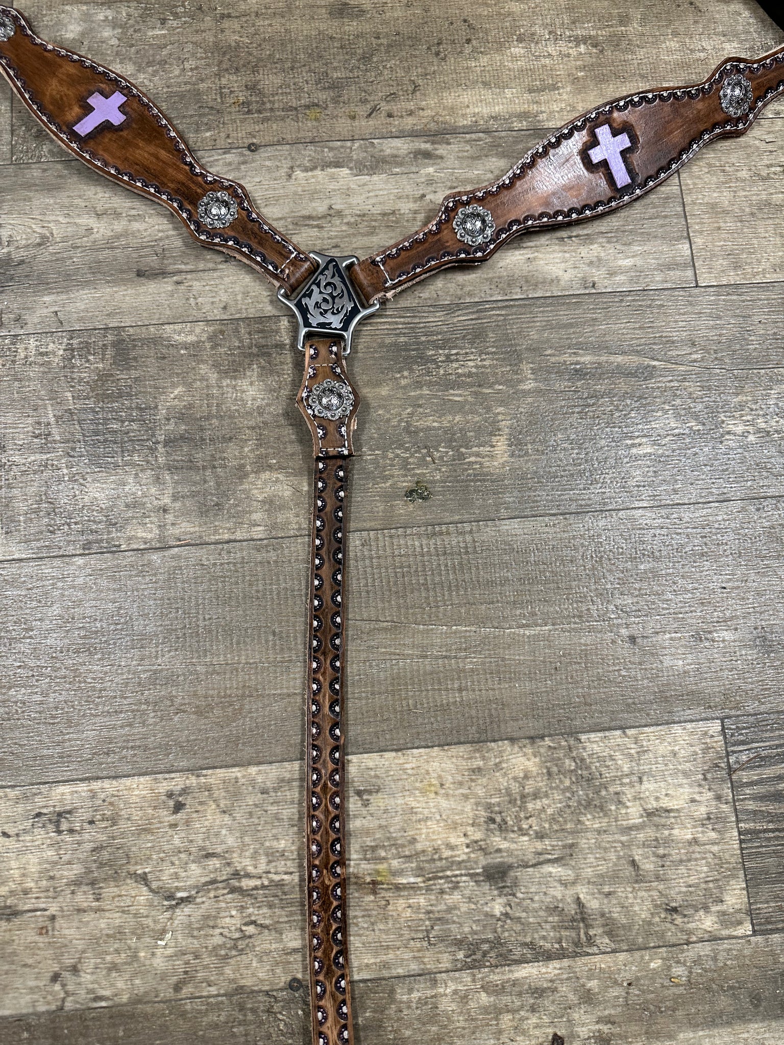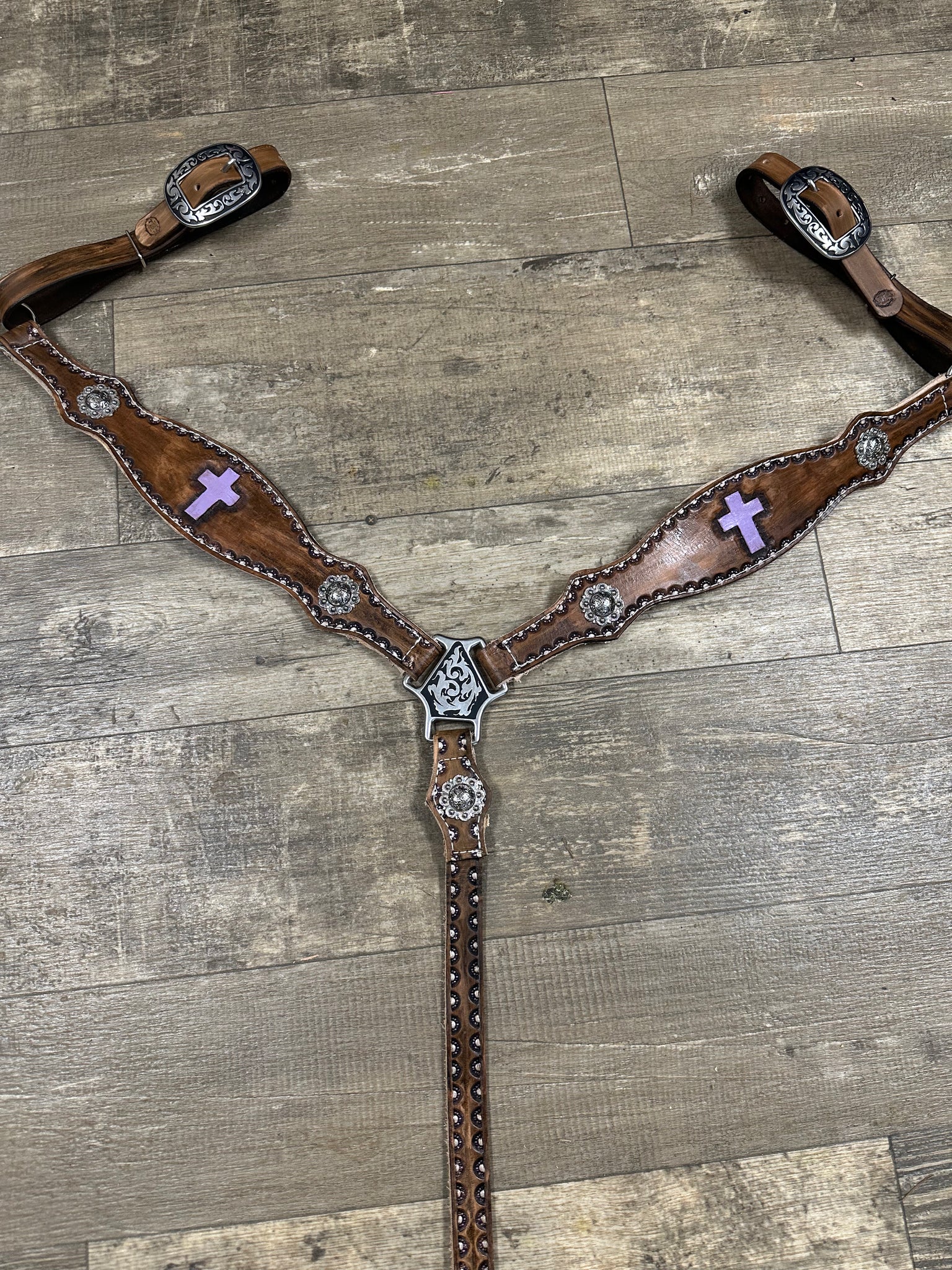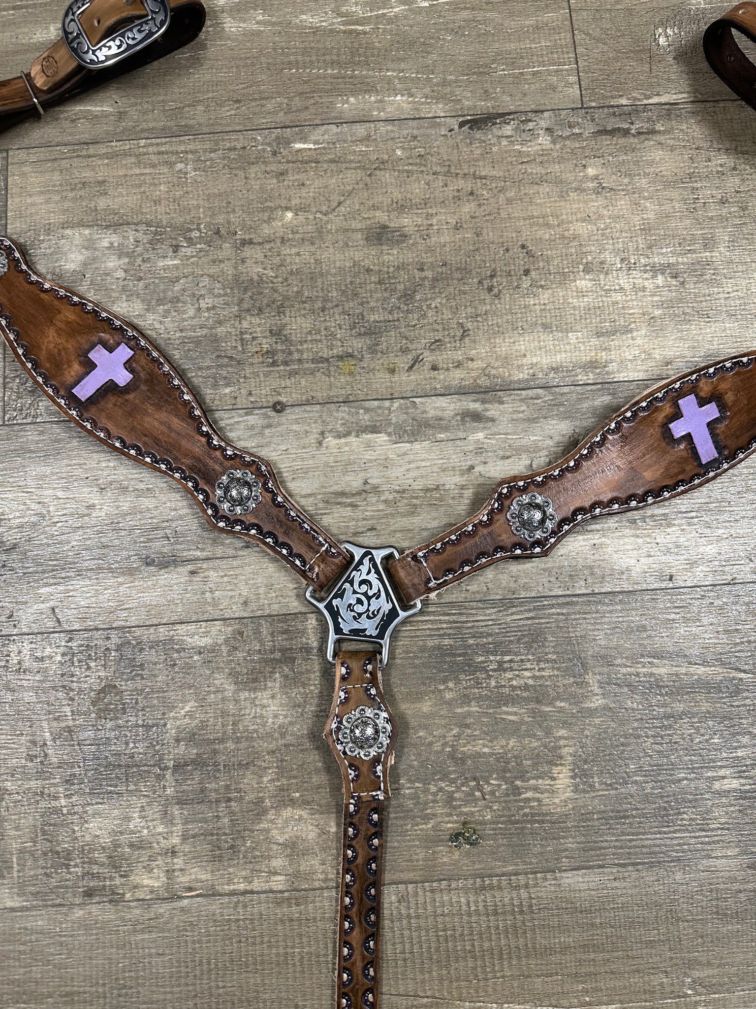 This leather breast collar and headstall  is made Live Oak Leather and is Handpainted and tooled with Lilac Crosses.