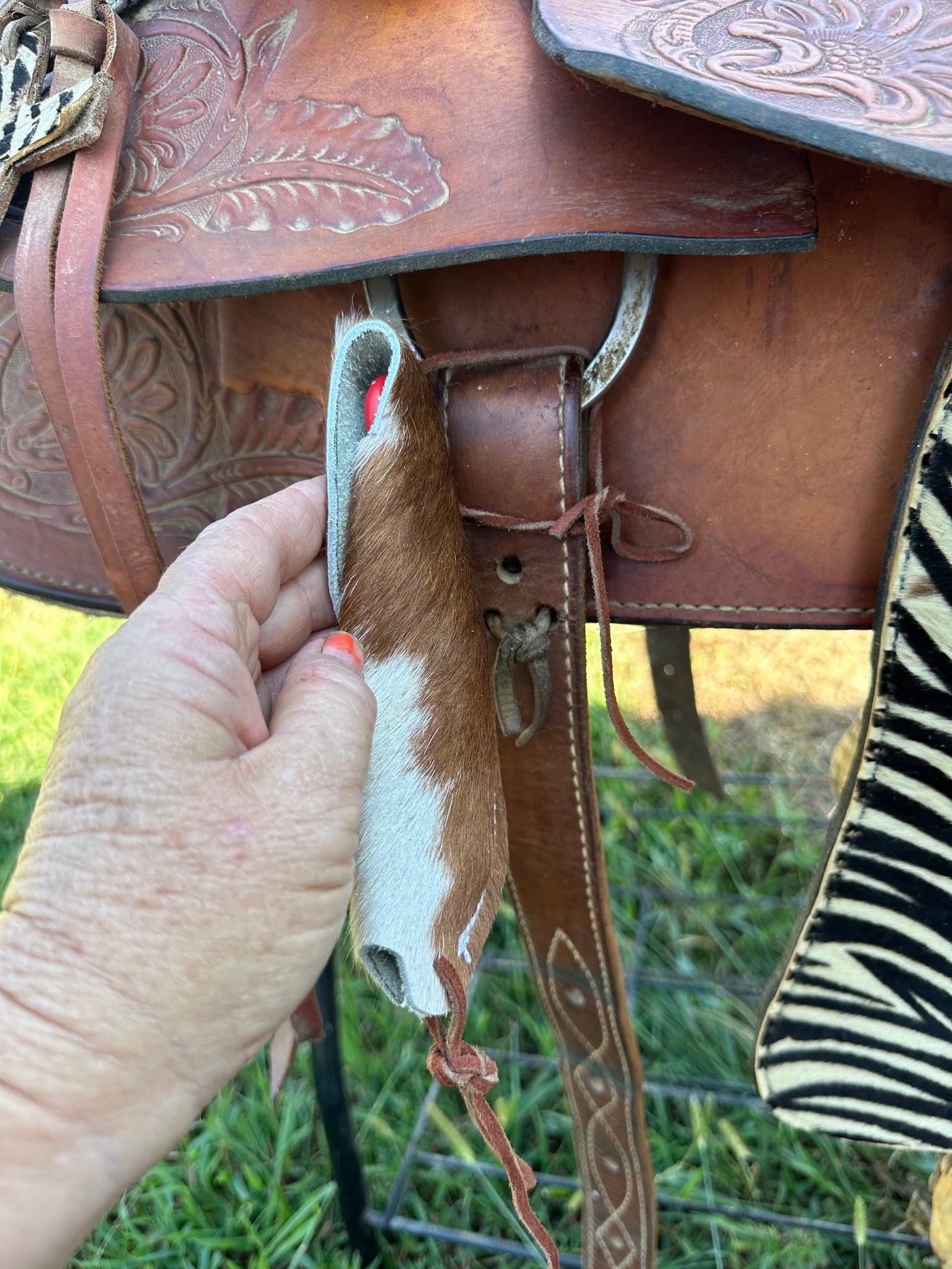 Have your hoof pick on your saddle when you need it.  This one comes with a hoof pick and ties to your saddle. The first one in the picture is the exact one you will get.  The others show how it attaches.