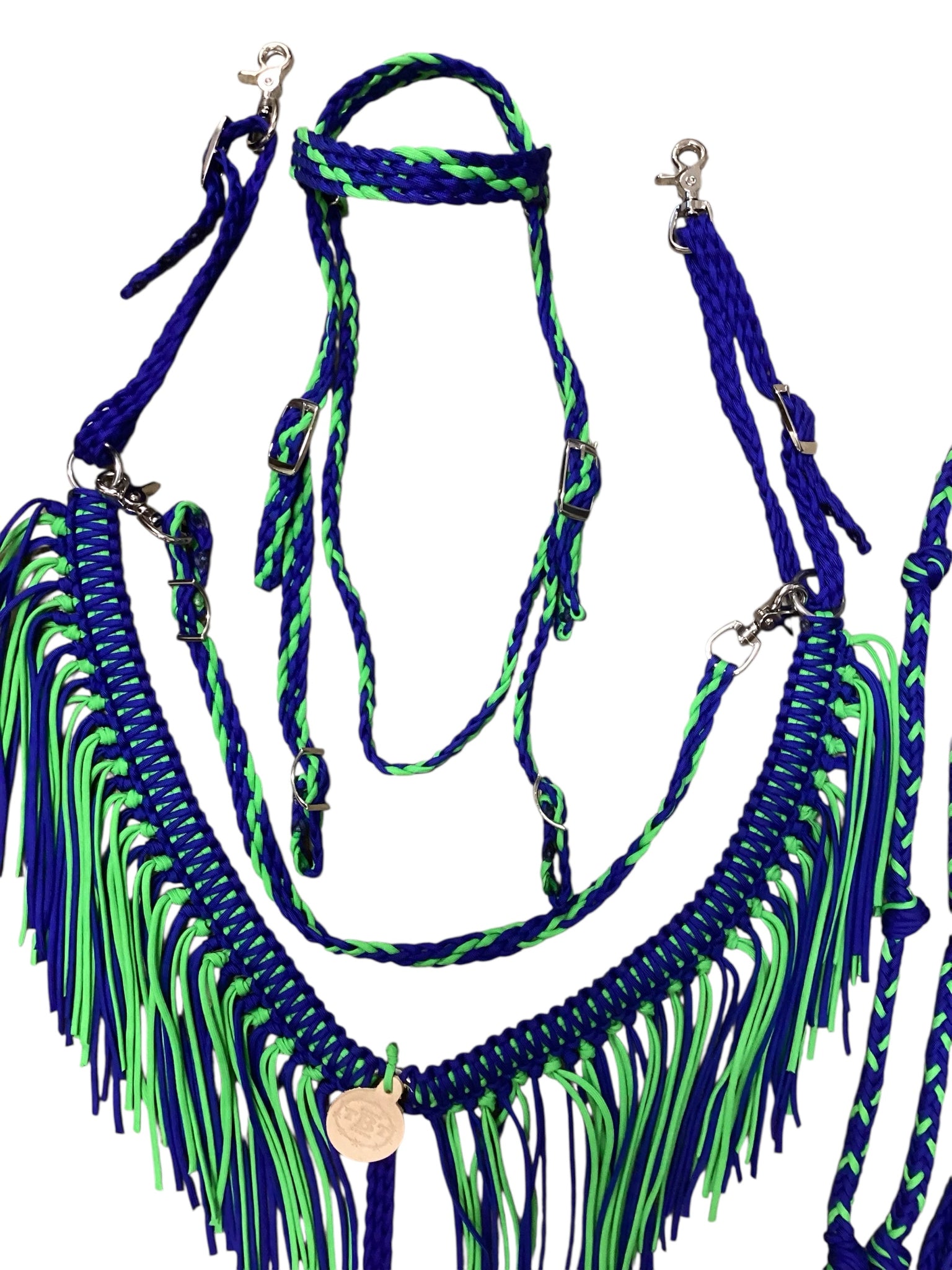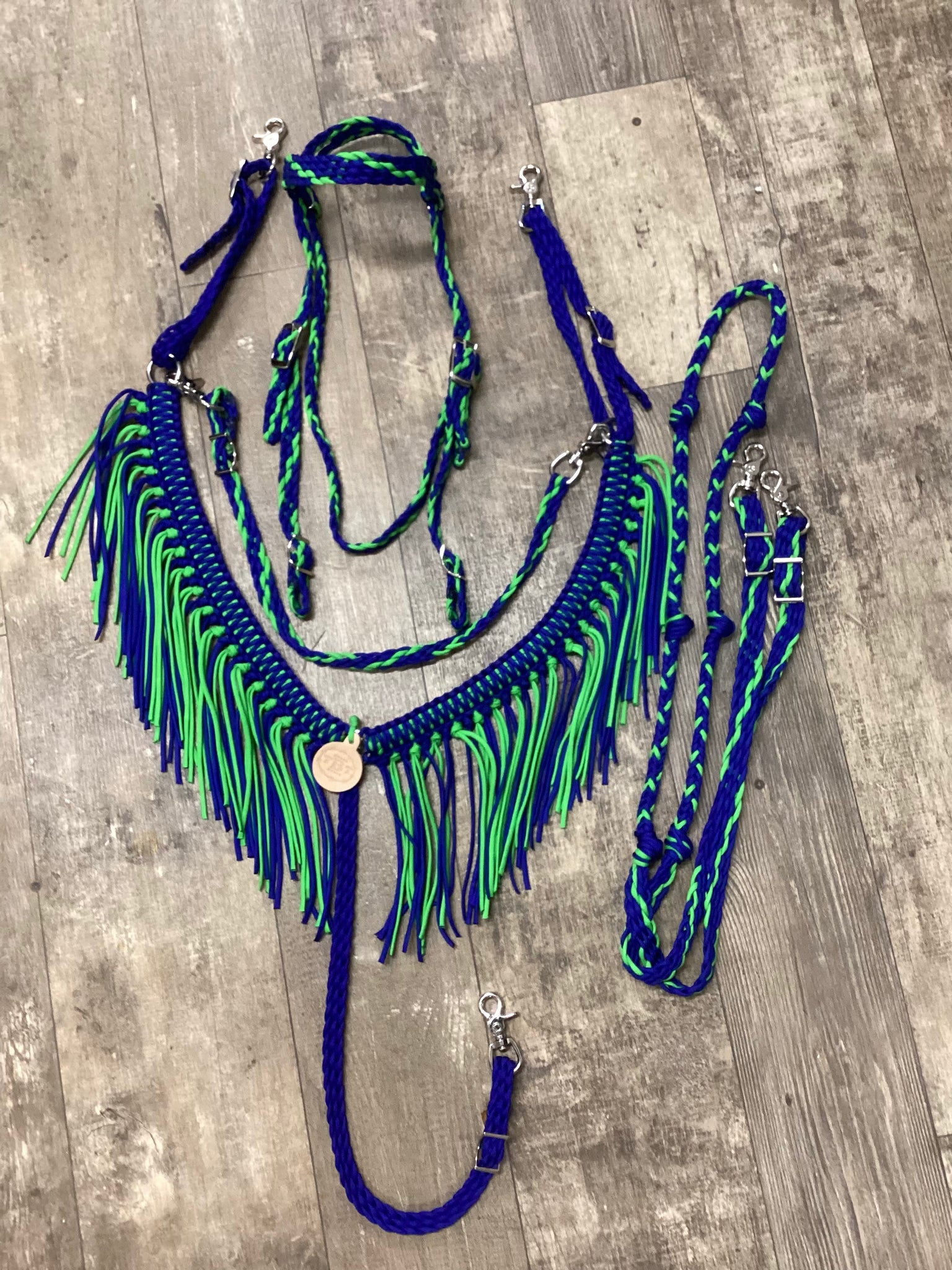 Electric Blue and Neon green Tack set with barrel reins …. All sizes.