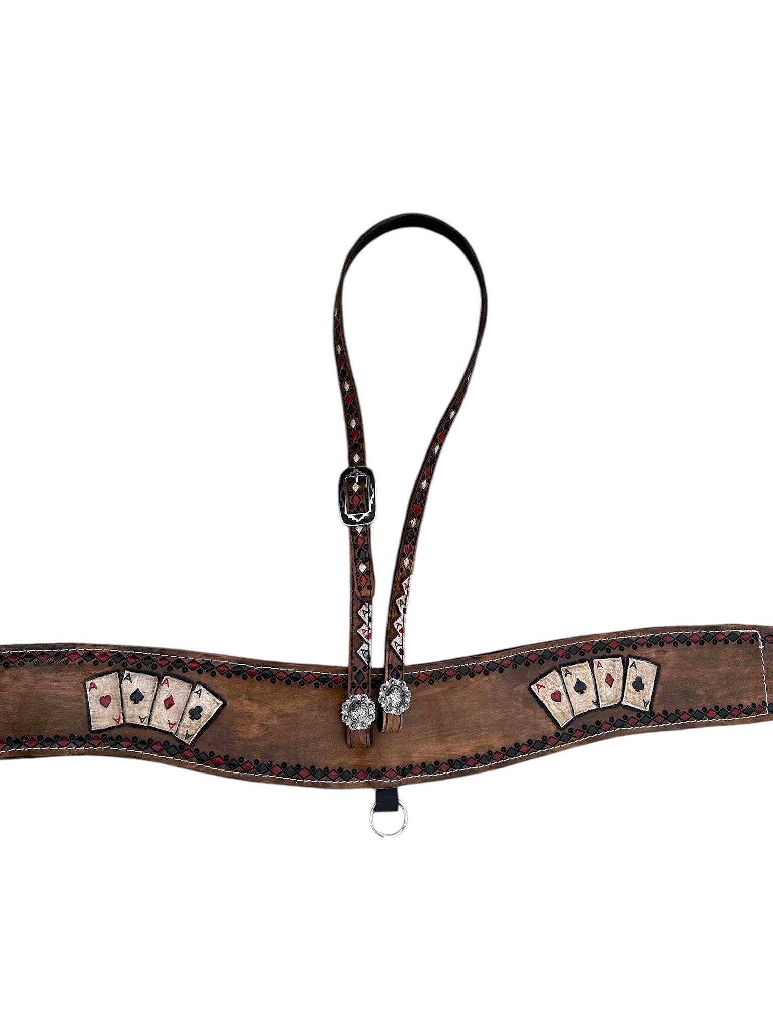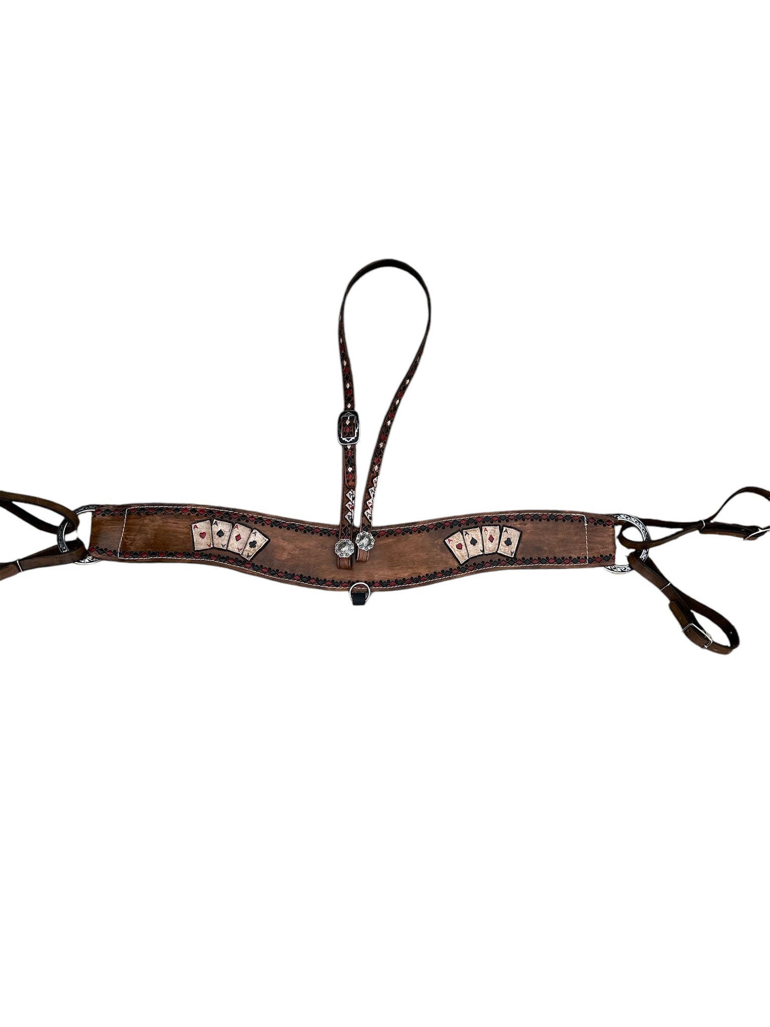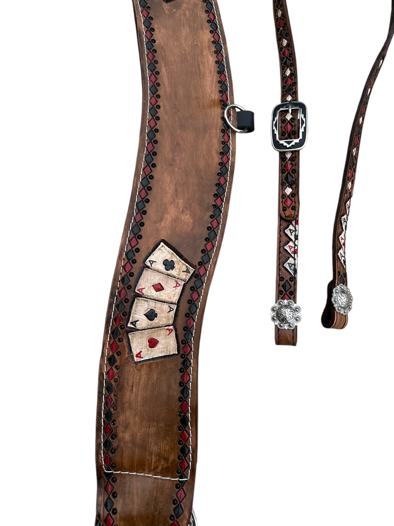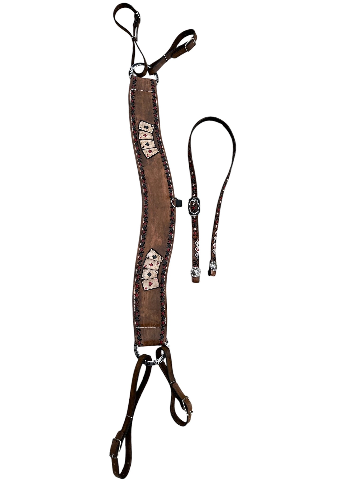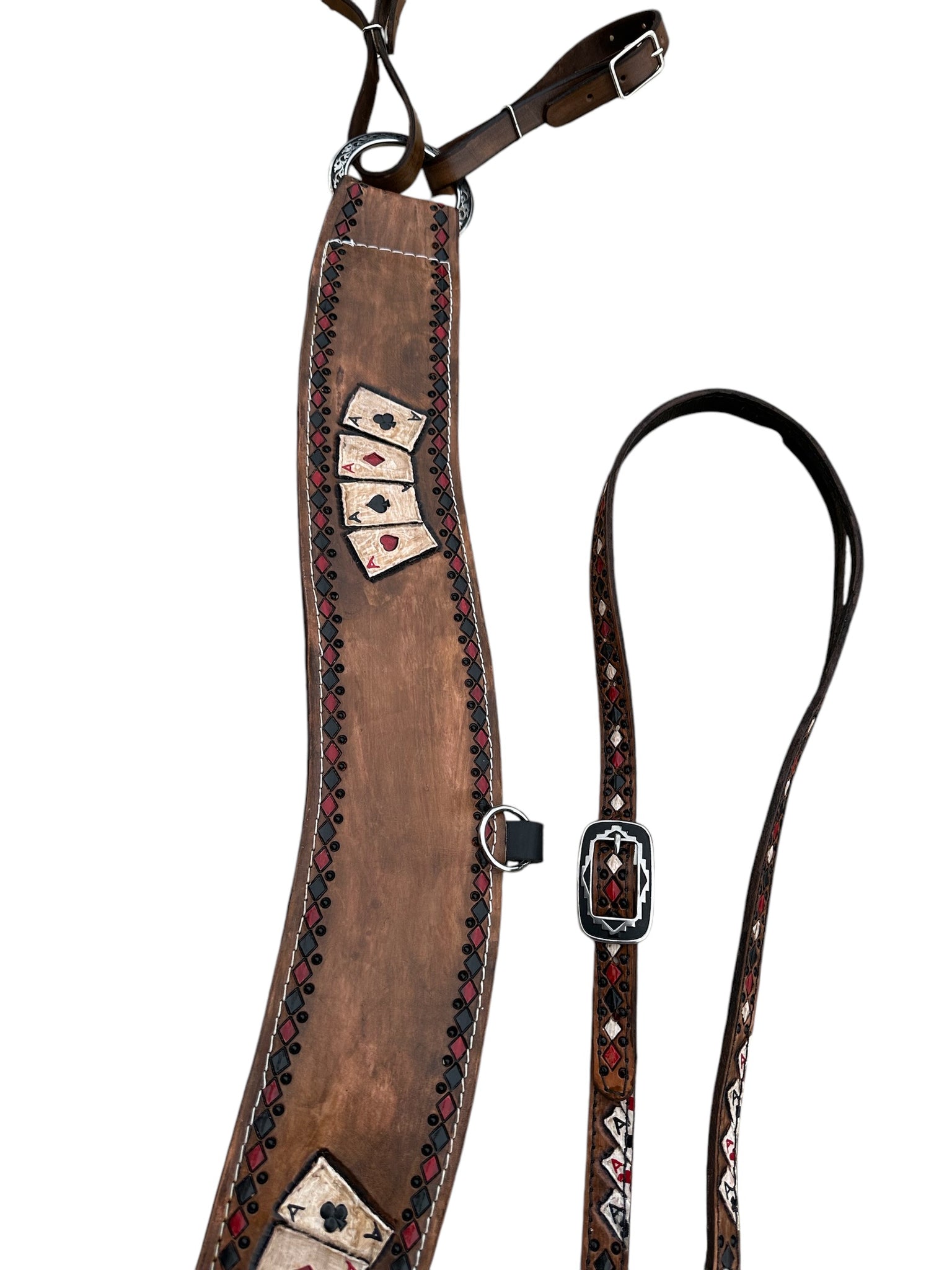 the headstall lets out to 42” and is also hand painted and tooled with the 4 aces design.