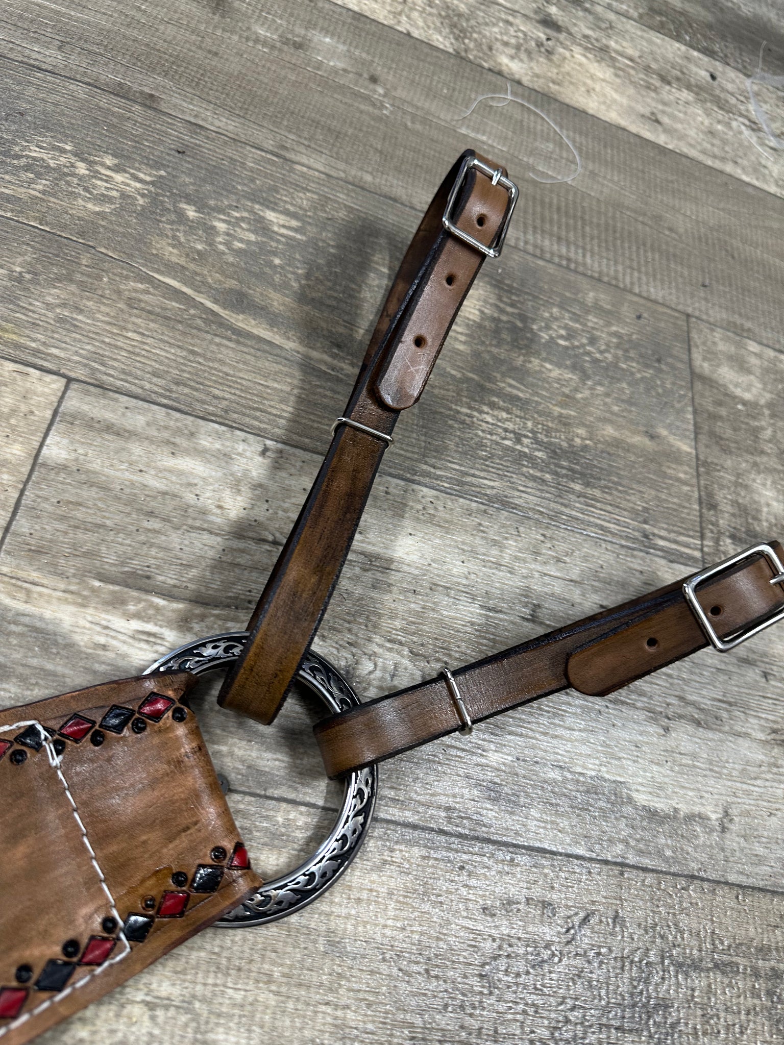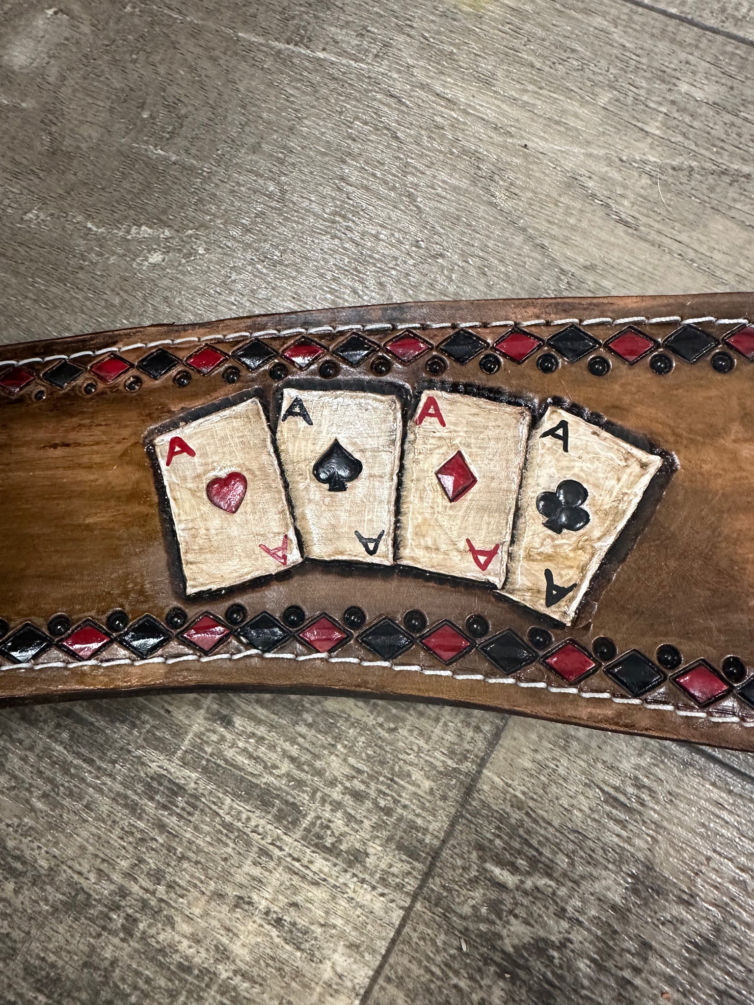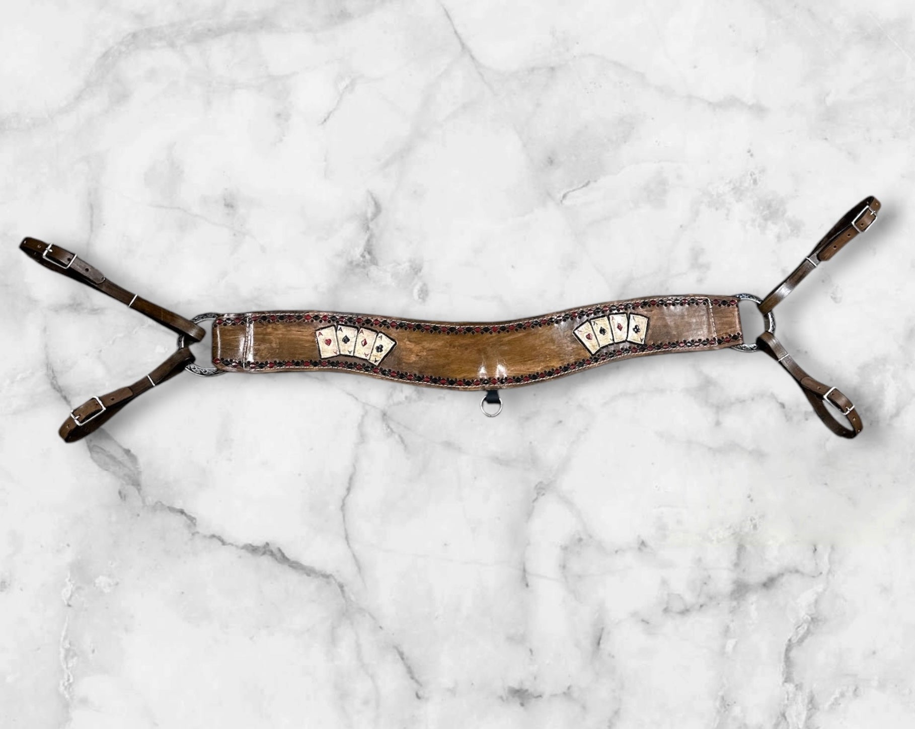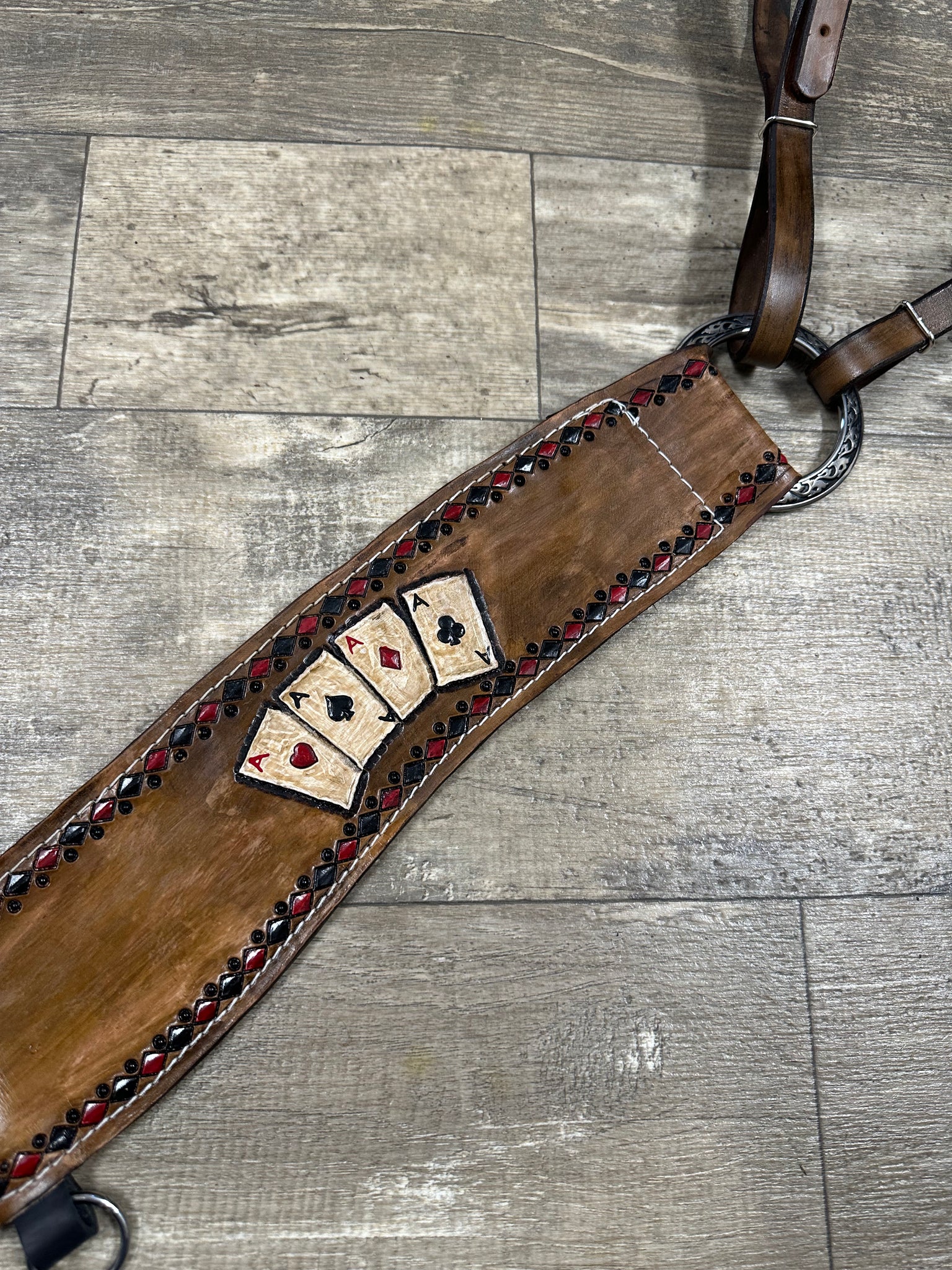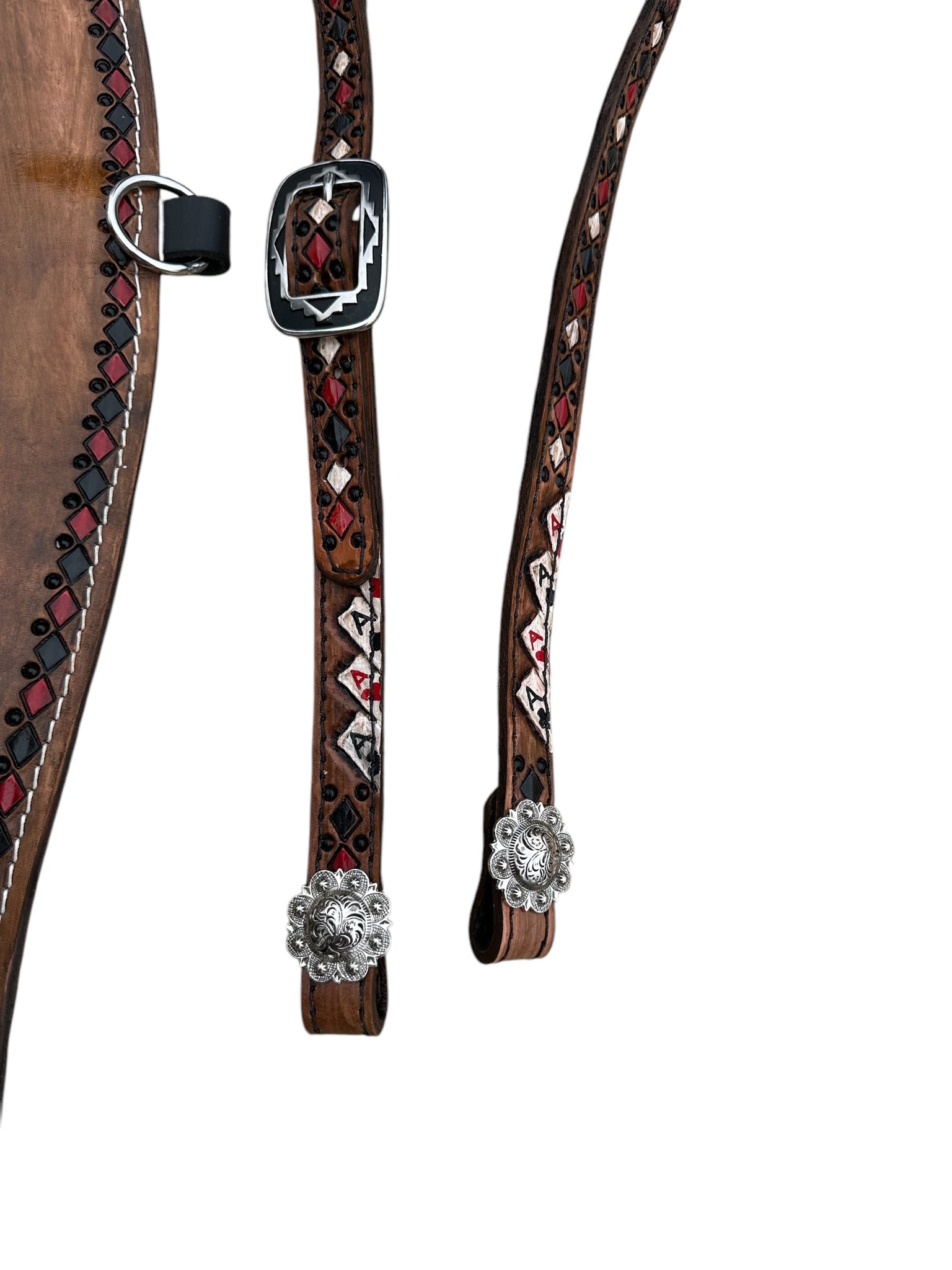 the headstall lets out to 42” and is also hand painted and tooled with the 4 aces design.