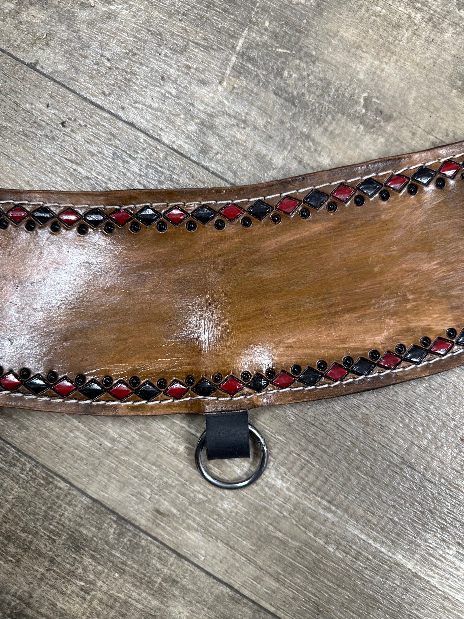 This leather tripping collar is made from live oak veg tan leather. It is hand painted and tooled. It lets out to 58” and can be taken up a good bit.